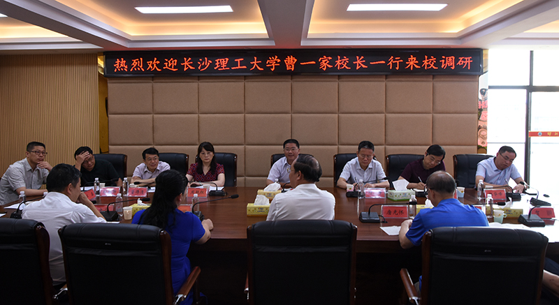7月16日上午,长沙理工大学党委副书记、校长曹一家,党委委员、副校长叶泽一行来校调研对口支援工作。校党委副书记、校长彭希林致欢迎辞并介绍学校情况。座谈会由党委委员、校长助理、党政办主任赵敏丽主持。