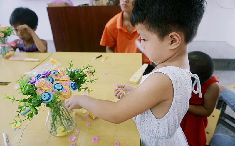 接下来便是“创意手工”小课堂,通过简单的热身游戏,让他们体会到手工的多彩性。随后,在志愿者的引导下,很多小朋友都被服务团成员摆出来的手工艺品所吸引,纷纷找服务团成员要材料,现场教学虽然显得有些手忙脚乱,但服务团成员毫不埋怨,依然埋头认真的教小朋友们制作专属的扇子、纽扣花瓶……忙的不亦乐乎。团队成员手把手的带着小朋友在空白的扇子上画小朋友们喜欢的东西,一边耐心的教学,一边惊叹着小朋友们天马行空的想象力。在服务团成员的耐心教导下,一幅幅精美的扇子呈现在大家面前,也齐心协力顺利完成了纽扣花瓶的制作,看到孩子们开心的笑脸,服务团成员的心里泛起满足感。服务团成员在与孩子做手工的同时,与孩子们进行简单的交流谈话,用温暖的话语走进孩子们的内心世界,为孩子们疏解心理上的烦恼,力所能及地给予孩子们帮助,让孩子们感受到哥哥姐姐的关爱,引导他们健康快乐地成长。