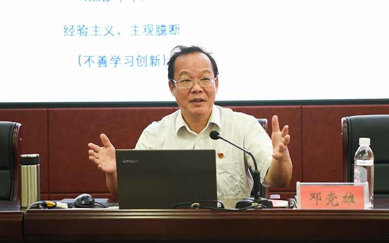 校党委书记邓党雄在《领导干部要善于抓落实》的辅导报告中强调,抓落实是目标实现的根本途径,是干部政治品质、思想水平、工作能力、职业素养的体现。他强调,领导干部要有责任感,对所从事的职业具有敬畏感;要找到努力的方向,正确认知工作目标;要掌握实情,全面分析影响目标实现的各项因素;要制订可行性方案,将工作任务具体落实到人;要接到任务立即行动,大力弘扬“马上就办”精神;要善于学习借鉴和创新,找到解决问题的方法;要学会检查和纠错,树立正确的“错误观”,及时止错纠错;要注重工作细节,防止“小事坏大谋”;要坚持不懈朝着既定目标努力奋斗,排除一切困难;要善于总结经验,学会自我激励。他指出,抓落实要防止纸上谈兵,花拳绣腿;繁文缛节,不得要领;教条主义,保守僵化;经验主义,主观臆断;轻视小事,忽视细节;虎头蛇尾,躲避困难;缺乏合作,分工不明等七类问题。