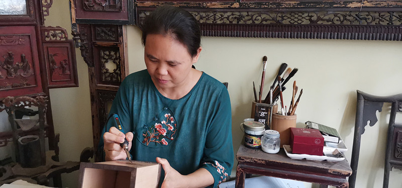 王艳萍在认真雕刻作品